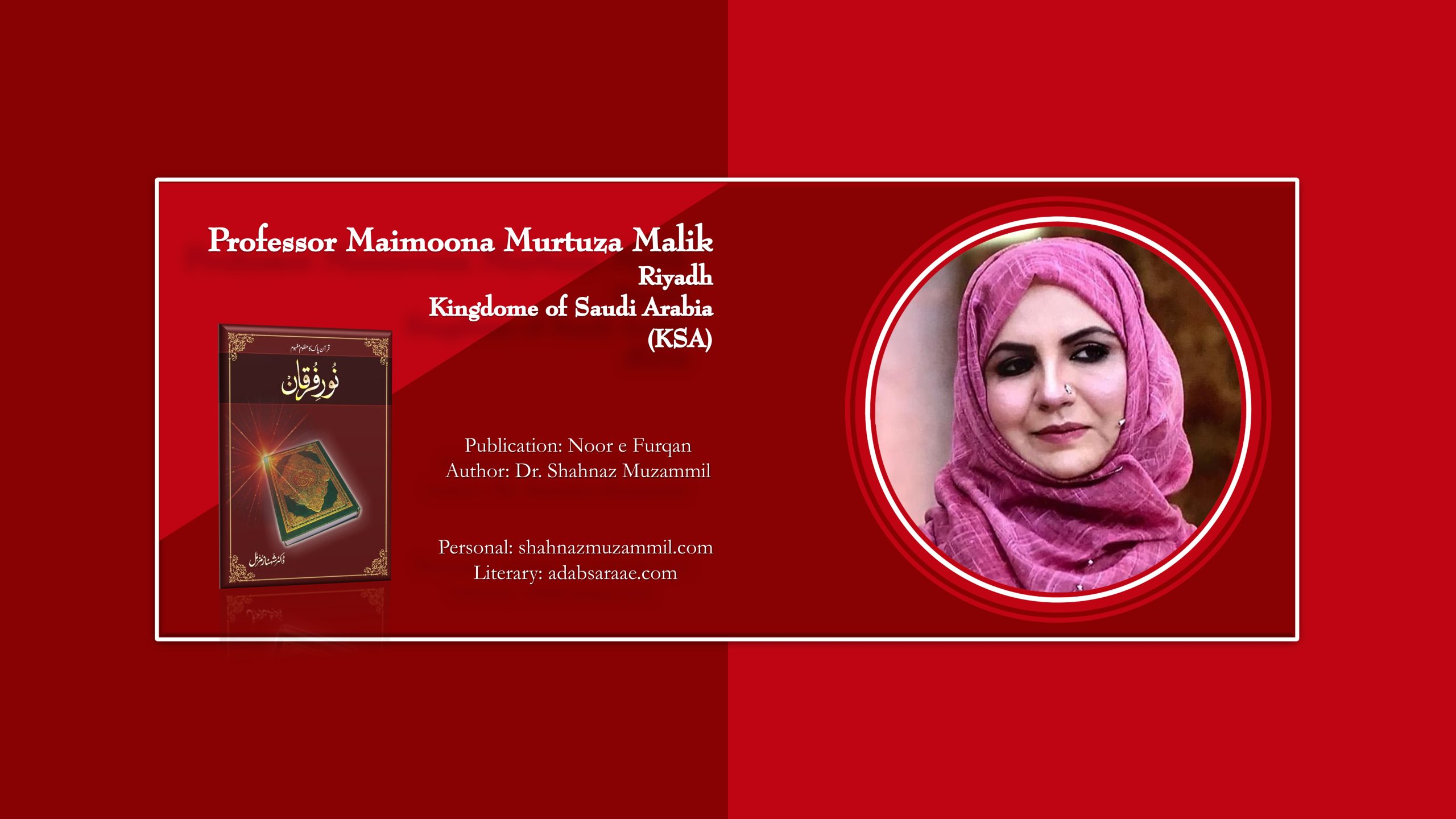 ڈاکٹر شہناز مزمل صاحبہ انہیں چند مخصوص لوگوں میں سے ایک ہیں۔ اللہ سبحانہ تعالیٰ نے انہیں علم و ادب اور دین کی خاص فہم عطا فرمائی ہے۔ زیرِ نظر منظوم ترجمہ ایک شاہکار ہے محترمہ کا اور یقینا اُن کی آخرت کی فلاح بھی اسی میں پوشیدہ ہے۔ میں اپنے لیے باعثِ تعرف و کرامت تصور کرتی ہوں اس عزت رتبہ کے گو کہ میں خود کو ہرگز بھی قابل نہیں پاتی ہوں لیکن ڈاکٹر صاحبہ کی محبت و شفقت نے مجھے آج با عزت اور قد آور بنا دیا۔ محترمہ سے سعودی عرب میں اکثر ادبی و مذہبی نشست انفرادی و اجتماعی رہی اور مجھے آپ سے استفادہ کا خاطر خواہ موقع بھی ملا۔ آپ کی علمی قدردانی تو رب الّعزت کے پاس محفوظ ہے لیکن بحیثیت ایک طالبعلمہ کے میں خود ان سے ان کے ادبی ذوق سے اور دینی لگاوٹ سے متاثر ہوئی ہوں۔ ڈاکٹر صاحبہ بہت شفیق و مہربان ہستی ہیں۔ انسانوں سے ان کا تعلق مثالی تو تھا ہی ، اب اللہ تعالیٰ کے ساتھ تعلق کی مضبوطی اور روح کی پاکیزگی کے حصول میں جو مقام قرآن کریم کو حاصل ہے ڈاکٹر صاحبہ نے اس ذوق کو پا لیا ہے۔ قرآن مجید کا مفہوم اس حسین انداز سے، کہ سماعت و قلب و روح سب پر رحمت باران بن کر برسنے لگے۔ اللہ ڈاکٹر صاحبہ کی اس محبت و معرفت کو اپنے وہاں مقبولیت و قبولیت سے سرفراز فرمائے اور قارئین کرام بھی اس تحفہ سے اسی قدر بہرہ مند ہوں جس قدر سعادت پڑھنے والوں کو حاصل ہو۔اللہ سبحانہ و تعالیٰ اسی قدر فلاح و بلندی درجات ڈاکٹر صاحبہ کو عطا فرما کر دنیا و آخرت کی سرخروئی و سر بلندی سے نوازیں۔